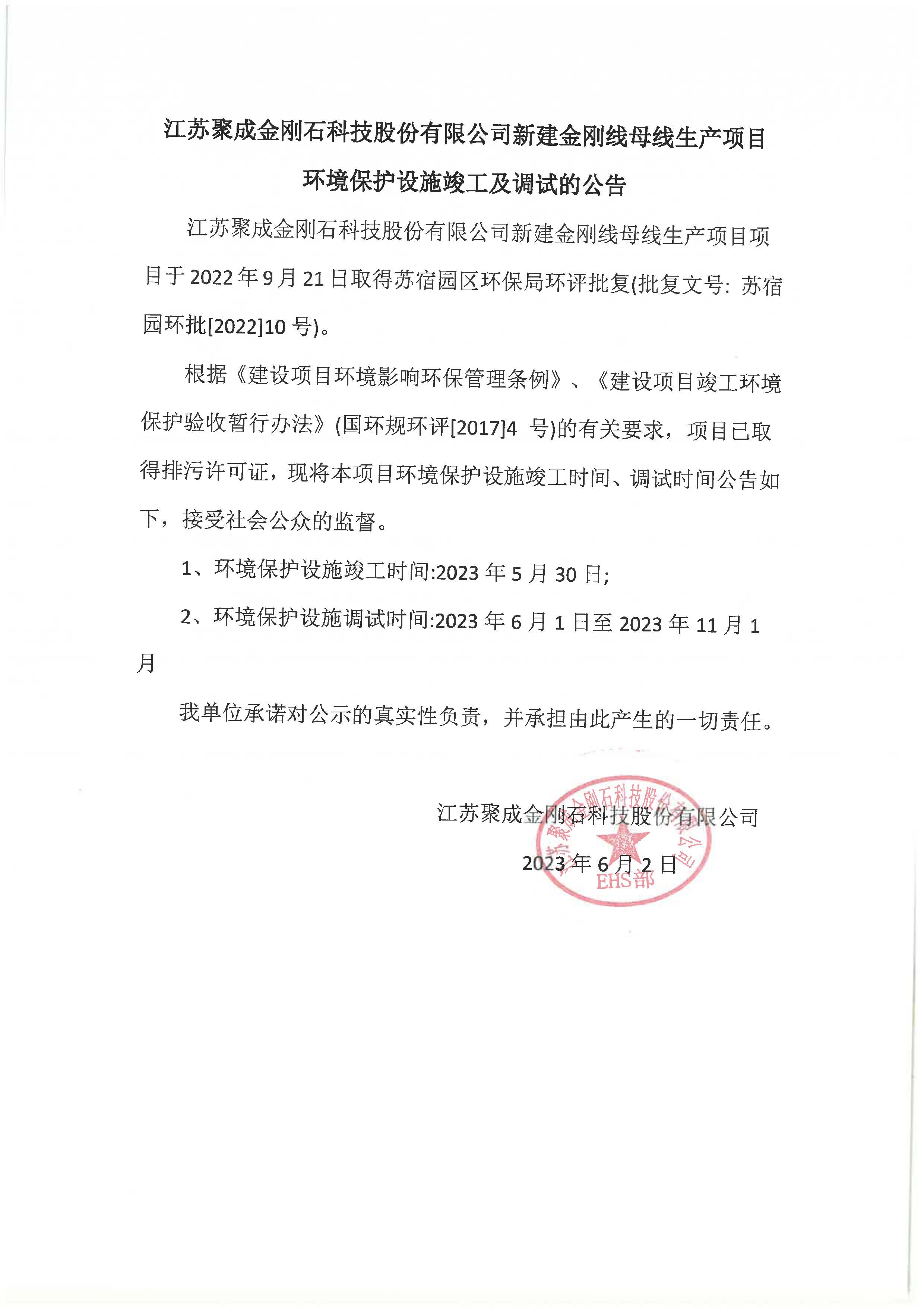 江蘇聚成金剛石科技股份有限公司新建金剛線母線生產(chǎn)項(xiàng)目環(huán)境保護(hù)設(shè)施竣工及調(diào)試的公告